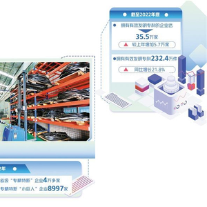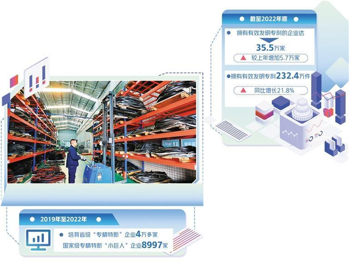 近年来,我国中小企业创新水平不断提升。截至2022年底,我国国内拥有有效发明专利的企业达35.5万家,较上年增加5.7万家,拥有有效发明专利232.4万件,同比增长21.8%。其中高新技术企业、专精特新“小巨人”企业拥有有效发明专利151.2万件,占国内企业拥有总量的65.1%。与此同时,我国“专精特新”等优质中小企业群体不断发展壮大。2019年至2022年,已培育省级“专精特新”企业4万多家,国家级专精特新“小巨人”企业8997家。