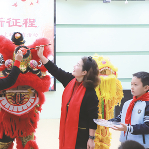 逸夫小学的老师用朱砂为狮子点睛,希望把平安、健康、聪慧带到校园每个角落