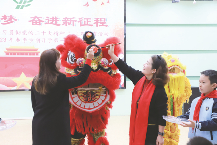 在大联小学,同学们穿过萌兔开学拱门,接过老师递给的兔年棒棒糖,预示新的一年定能“兔”飞猛进,前“兔”似锦!开学典礼上,热闹的舞狮表演点燃了现场。随后的糖画送福、升旗仪式、校长新学期寄语、课本剧表演、墨宝送福等环节让同学们感受到了新学期、新梦想。