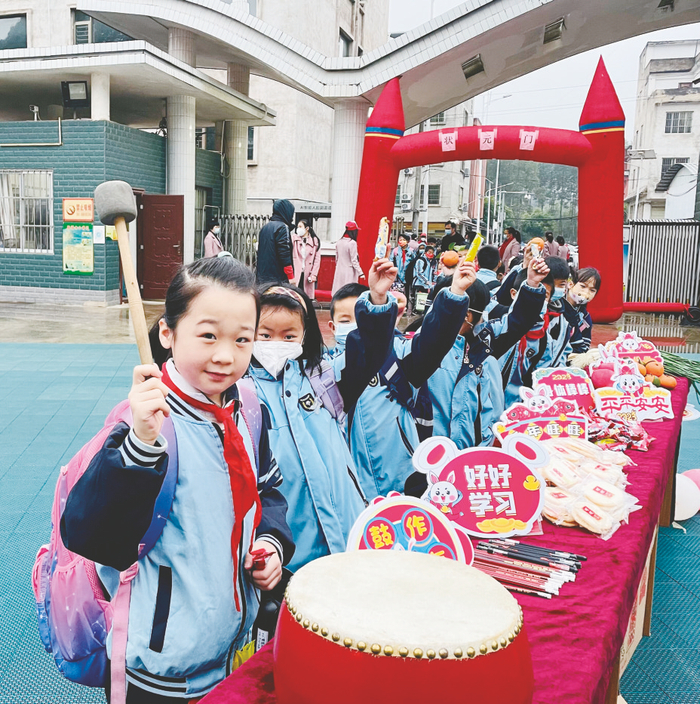 江南区江西镇中心小学校门的桌子上摆满了大葱、橘子、苹果、棒棒糖等礼物,寓意孩子们“聪明伶俐”“大吉大利”“平平安安”。同学们走过奋进门,摸摸大葱,敲敲大鼓,沾沾喜气,被这仪式感满满的小惊喜深深吸引。