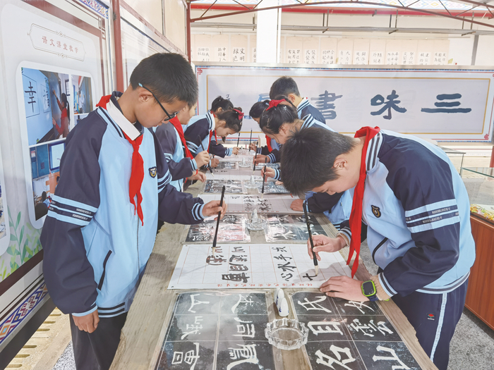 ◀二塘小学学生现场挥毫泼墨,展示书法功力