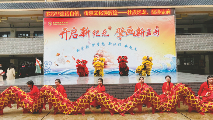 南宁五中在校园广场举行春季学期开学典礼。活动通过开学第一课宣讲——介绍非遗壮刀金工项目,以及南宁市特色艺教泥塑工作室带来壮族炮龙、醒狮表演,将非遗与美育相结合,让师生零距离感受非遗民间艺术的魅力。