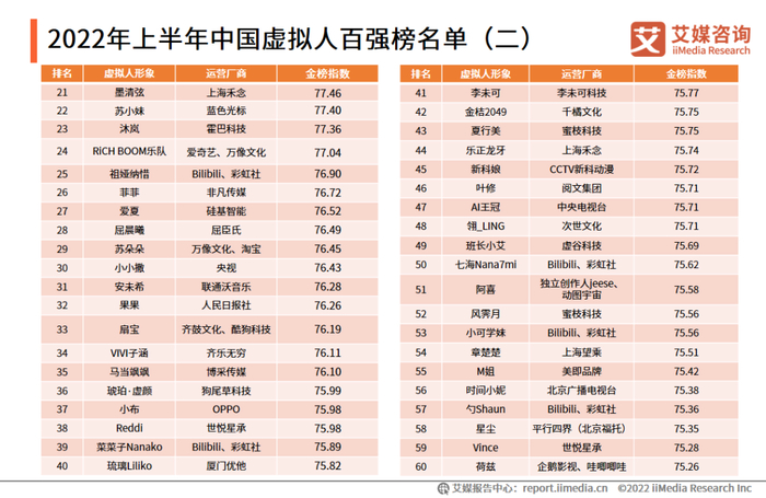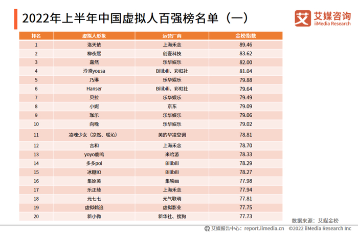 本次上榜《2022年上半年中国虚拟人百强榜》的虚拟人形象有洛天依、柳夜熙、嘉然、泠鸢yousa、乃琳等。其中,洛天依排名第一,柳夜熙和嘉然分别为第二名、第三名。