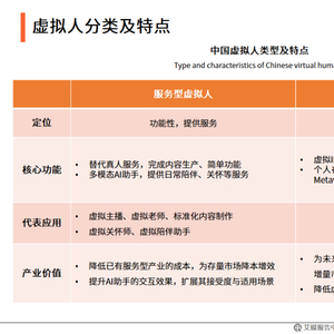 目前,虚拟人主要分为服务型虚拟人和身份型虚拟人。服务型虚拟人具有功能性,能够替代真人服务,完成内容生产以及一些简单的工作,降低已有服务型产业的成本。身份型虚拟人具有身份性,多以虚拟IP或偶像呈现,能够为未来的虚拟世界提供人的核心交互中介。