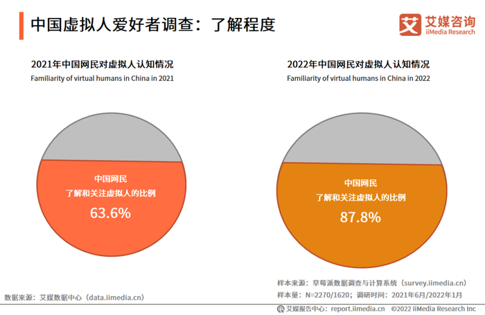 调研数据显示,相较于2021年,2022年中国网民对虚拟人的了解和关注程度更高,从2021年的63.6%的关注度上升至2022年87.8%。艾媒咨询分析师认为,社交媒体多元化发展,推动了虚拟人的宣传,网民渗透率提升。