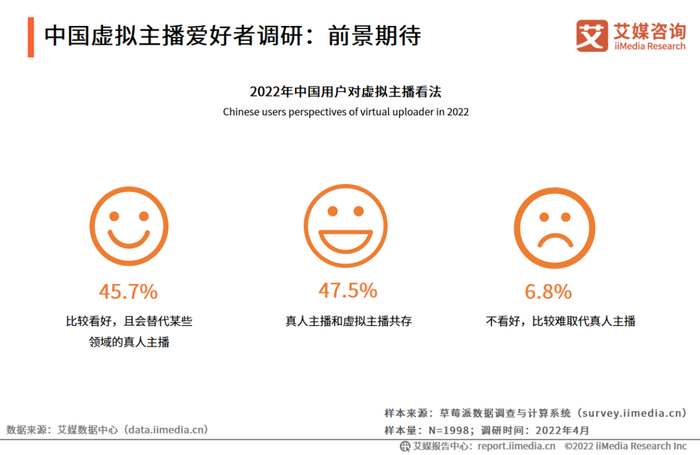 调研数据显示,47.5%的受访用户认为未来真人主播和虚拟主播将共存,45.7%的受访用户认为虚拟主播将会替代某些领域的真人主播。艾媒咨询分析师认为,大众对虚拟主播的认可度和接受度在不断提高。随着消费群体的需求多样化,未来,虚拟主播的应用将更加广泛。