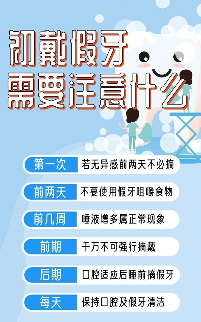 初戴活动假牙的前两天,不要用假牙咀嚼食物,这样做是为了避免假牙对尚未适应的黏膜造成损伤。如果第一次戴假牙后,没有不适的感觉,那么前两天睡觉时也佩戴着,从而加快口腔的适应,但饭后、睡前要做好口腔和假牙的清洁。待口腔组织适应假牙后,可以进食质地较软的食物,并感受假牙在咀嚼食物时是否存在不稳定或不适感,为复诊调改做好记录。