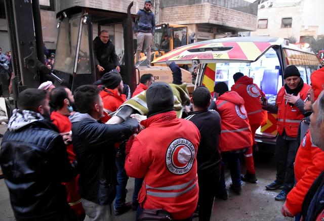 2月6日,人们在叙利亚哈马省转运伤者。新华社发