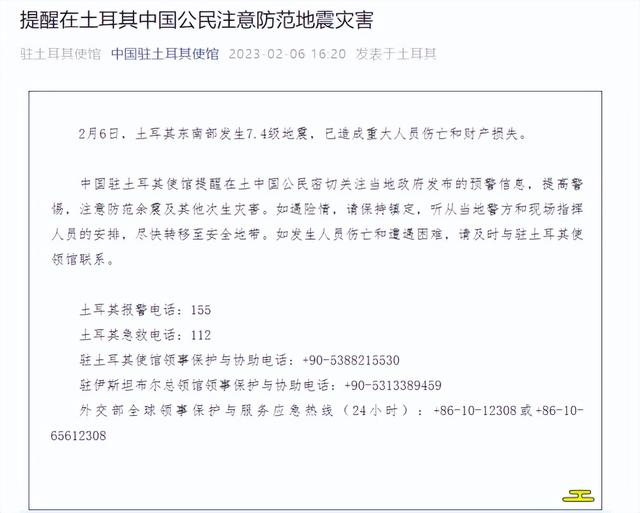 中国驻土耳其使馆:提醒在土耳其中国公民注意防范地震灾害