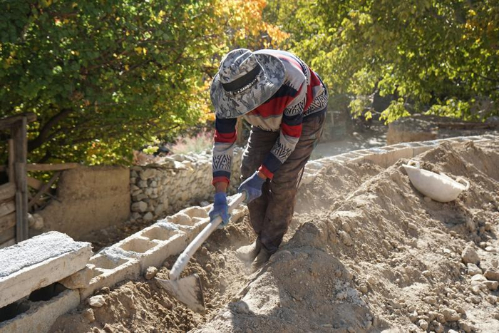 丁争老人正在修建村里的小花园。