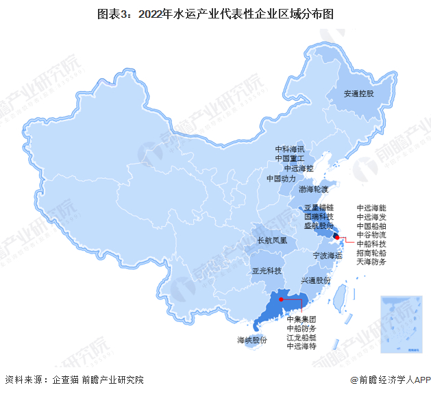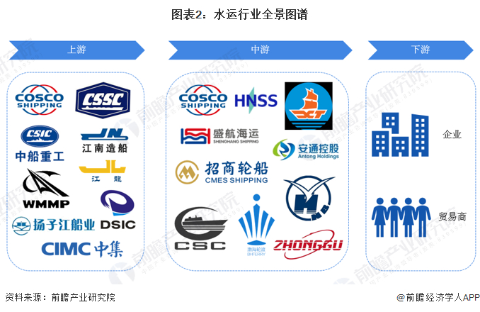 中国水运产业上游的企业包括中远海运重工有限公司、中国船舶集团有限公司、中船海洋与防务装备股份有限公司、江南造船(集团)有限责任公司、江苏扬子江船厂有限公司、武汉船用机械有限责任公司、大连船舶重工集团有限公司等船舶及相关设施设备制造企业,以及中集集团等集装箱制造企业;中国水运产业中游的企业则有中远海运特种运输股份有限公司、招商局能源运输股份有限公司、南京盛航海运股份有限公司、长航凤凰股份有限公司等。