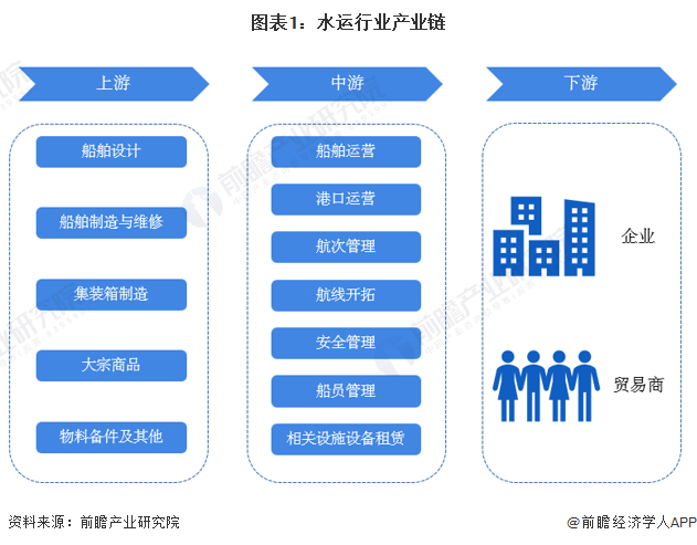 中国水运产业的上游包括船舶与集装箱等运输设备的设计、制造、维修,大宗商品的生产,以及运输所需的物料备件的制造;中游包括船舶和港口的运营、航次管理与航线开拓、安全管理、船员管理、相关设施租赁等领域;下游则主要是有贸易与运输需求的企业。
