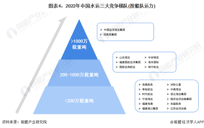 依据船队运力划分,水运行业企业可分为3个竞争梯队。其中,船队运力大于1000万载重吨的企业有中国远洋海运集团、招商局集团;船队运力在200-1000万载重吨之间的企业有山东海运、福建国航远洋集团、国能远海航云、中谷物流等;其余企业的船队运力在200万载重吨以下。