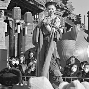 从正月初六开始,每日15时,关帝庙广场,人们纷纷驻足翘首,等待一场民族和谐史话的演绎。在关帝庙戏台前,身披红裘的“昭君”雍容登场,表演者陶靖蕊神态从容,在舞台上以优美舞蹈展现出王昭君完成和亲宁边使命、促成民族和睦的传奇故事。随后她在鼓楼东街进行巡游演绎,在众多威武将士和古典仕女衬托下,更展现出“昭君”神色庄重、温和坚定的气质。在鼓楼东街入口处,《千年微笑》错时精彩上演,表演者范晶微笑可人、舞姿古雅,动作神态与华严寺合掌露齿菩萨完美契合。