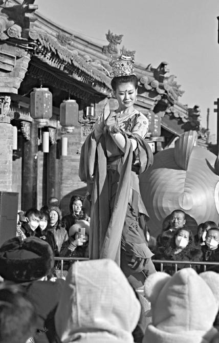 在府文庙内及云路街上,由千古平城剧组打造的《云路纳福》《金榜题名》《钟馗贺岁》三部沉浸式明朝古装演艺,以丰富的内涵、美好的祝愿、精彩的互动,充实了人们的精神文化生活,让游客在年味里感受到了古城文韵。许多游客表示他们带着孩子前来观赏,以此劝学励志。