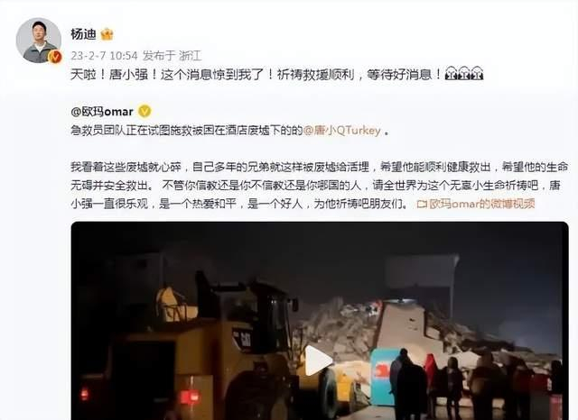 随后,杨迪转发微博为唐小强祈祷:“祈祷救援顺利,等待好消息!”