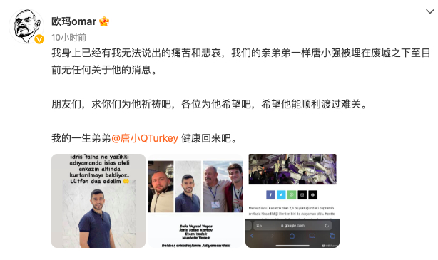土耳其地震引发全球关注。IP属地显示在土耳其的博主@欧玛omar 爆料称,自己的好友、湖北卫视节目《非正式会谈》的常驻嘉宾唐小强被埋在一处酒店的废墟之下,目前急救员团队正在试图施救被困在酒店废墟下的唐小强。