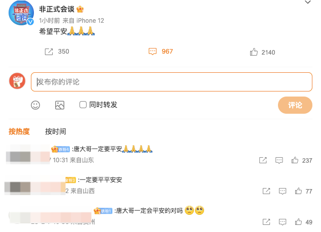 《非正式会谈》节目组官方微博发文:“希望平安”,并配上三个双手合十的祈祷表情。该条微博下的评论也都是“唐大哥一定要平安”“希望唐大哥平平安安”……