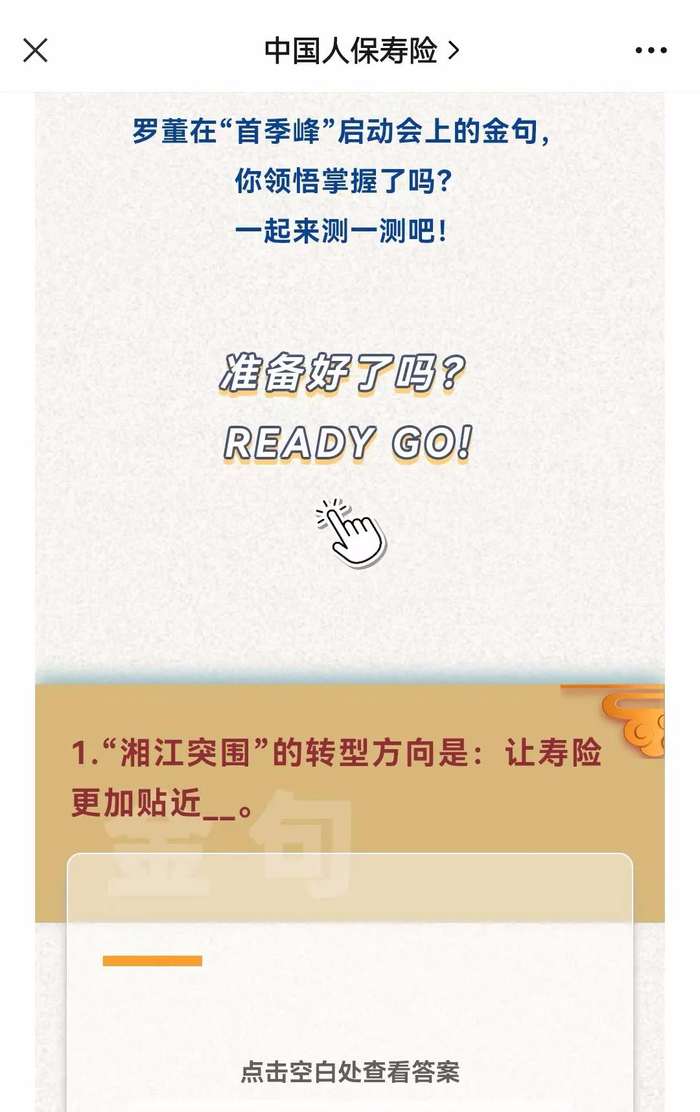 今年1月29日,“中国人保寿险”公众号推送了《以考促学,一套题带你牢记“首季峰”金句》的文章。文内的多道填空题,均是罗董事长的致辞“金句”。
