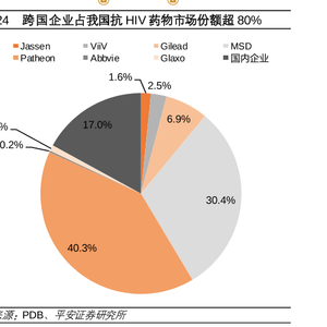 根据弗若斯特沙利文数据,2021年,我国HIV病毒药物市场规模2为4亿美元左右,仅为同期全球市场规模的1%。市场格局来看,前五大抗HIV病毒药物以进口药和国产仿制药为主,跨国企业占据国内市场的80%左右,包括艾可力在内,国产抗HIV创新药仅有3款上市销售,并且相对份额较小。