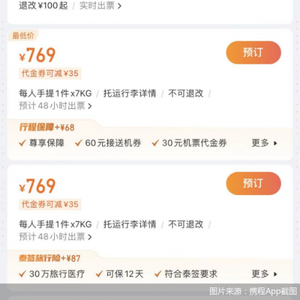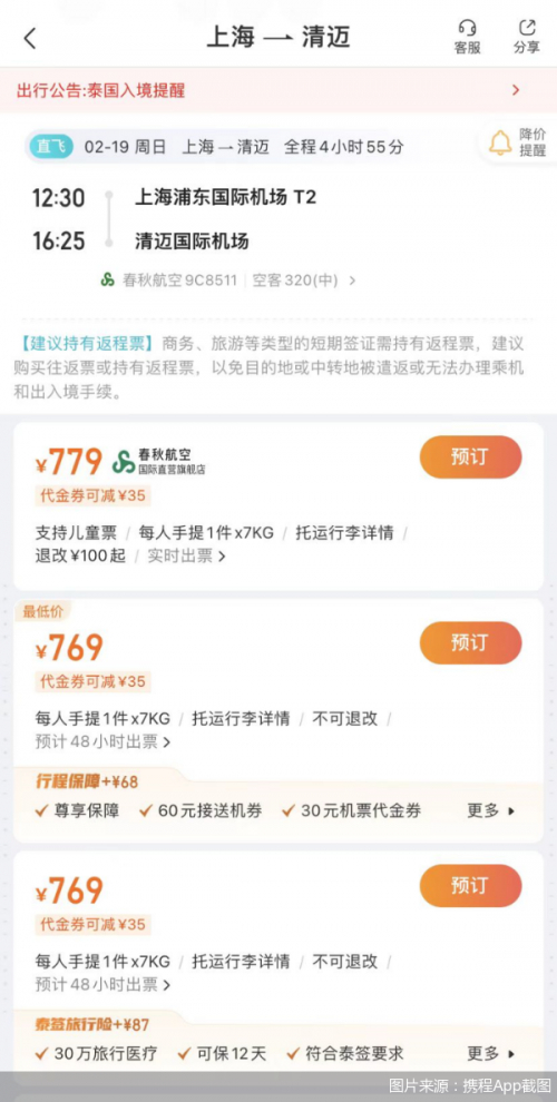 北京商报记者查询携程机票预订平台发现,上海-清迈航线出现了低于千元的机票价格,春秋航空9C8511航班2月19日经济舱票价低至769元,同航班2月18日同时段经济舱票价为869元。