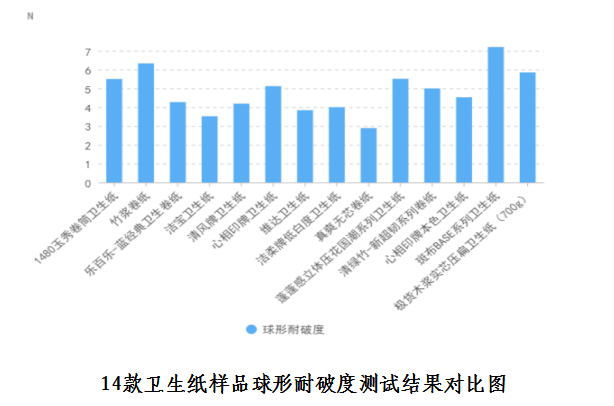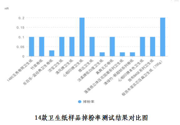 针对卫生纸,广西消委会还开展球形耐破度指标测试与掉粉率指标测试。球形耐破度的力值越大,在使用时越不容易破,但力值过大也可能相应的柔软度值也大,使用起来不够柔软;掉粉率主要考核卫生纸在使用时产生的纸屑、粉尘掉落情况。测试结果显示,14款卫生纸样品的球形耐破度均符合国家标准,掉粉率数据较小,最大值为0.2%,最小值0.02%。
