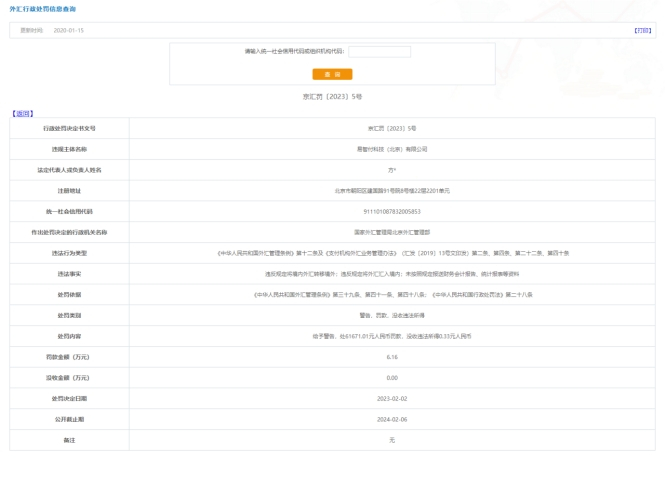 上述违法行为类型属于《中华人民共和国外汇管理条例》第十二条及《支付机构外汇业务管理办法》(汇发〔2019〕13号文印发)第二条、第四条、第二十二条、第四十条。依据《中华人民共和国外汇管理条例》第三十九条、第四十一条、第四十八条;《中华人民共和国行政处罚法》第二十八条,国家外汇管理局北京外汇管理部对该公司给予警告,处61671.01元人民币罚款,没收违法所得0.33元人民币。