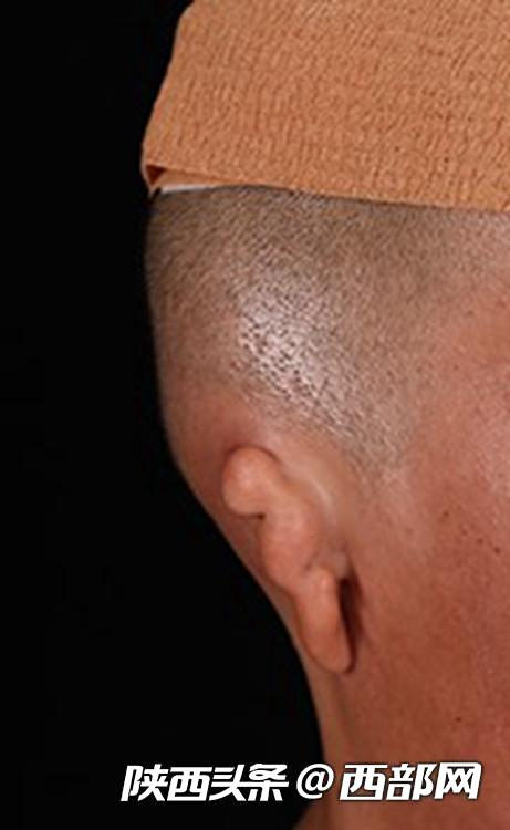 一期“皮肤扩张器植入术”后扎西(化名)右耳上方皮肤微微鼓起。