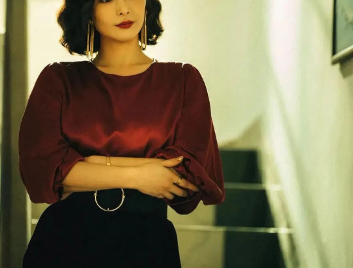 这阶段她的服饰以丝滑绸缎为主,耳环、戒指、手镯、美甲都是金色,有点富贵逼人的意思。