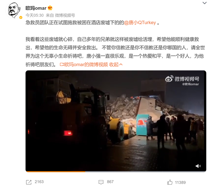 今天凌晨,唐小强的好友在社交平台的上发文称,唐小强被埋在废墟之下,急救队员在试图施救。
