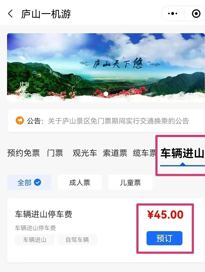 2.广大游客如需车辆预约进山,请提前登录“庐山一机游”微信或支付宝小程序,在进行个人“预约免票”的同时,进行“车辆进山”预约,成功后可在预约时间内凭预约“二维码”驶入景区。