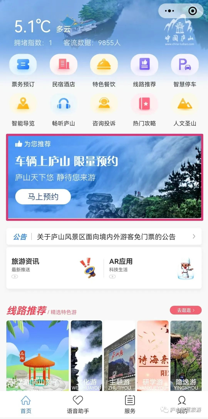 1.启动游客车辆预约进山管理,即2月8日凌晨0:00至3月15日晚上24:00(周末、节假日及重要活动期间除外),庐山景区核心景区(山上)对所有来山游客车辆实行预约进山。