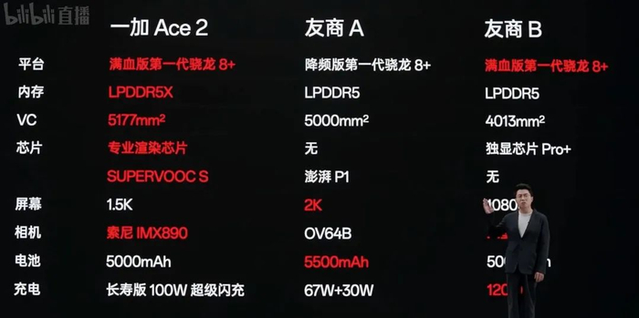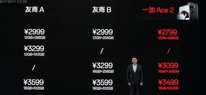 发布会上,一加中国区李杰是各种放话。在公布价格环节还对比了友商A(Redmi K60)和友商B(iQOO Neo7竞速版)。