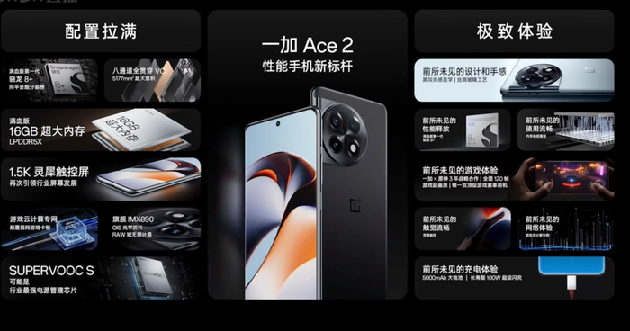 核心配置上,一加Ace2搭载骁龙8+满血版、LPDDR5x、UFS 3.1,5000mAh电池、100W长寿版闪充,首发OPPO SUPERVOOC S全链路电源管理芯片;前置16MP,后置三摄50MP有OIS(索尼IMX890)+8MP超广角+2MP微距,RAW域无损计算系统;X轴线性马达,立体双扬、支持NFC、红外遥控、预装基于Android 13的ColorOS13等。