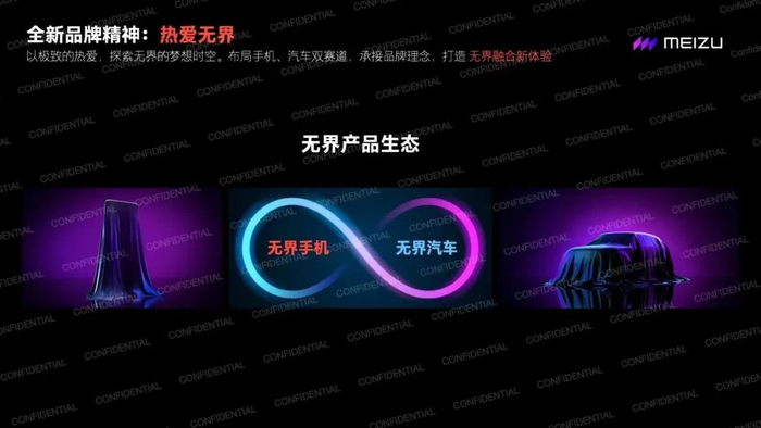 另外魅族这边也有新消息,继无界汽车后,魅族近日又申请了名为「无界手机」的商标,今天网上流传着一张疑似魅族内部PPT截图。