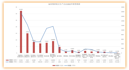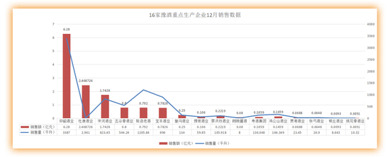 具体来看,仰韶、赊店老酒、杜康、五谷春、皇沟酒业五家酒企销售量7739.842千升,占16家企业总销量77.35%;销售额11.083亿元,占比76.87%。