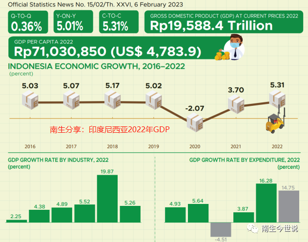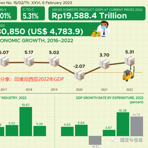 印度尼西亚国家统计局发布的信息:2022年的经济同比实际提升5.31%,增幅创下了自2013年以来的最高纪录。