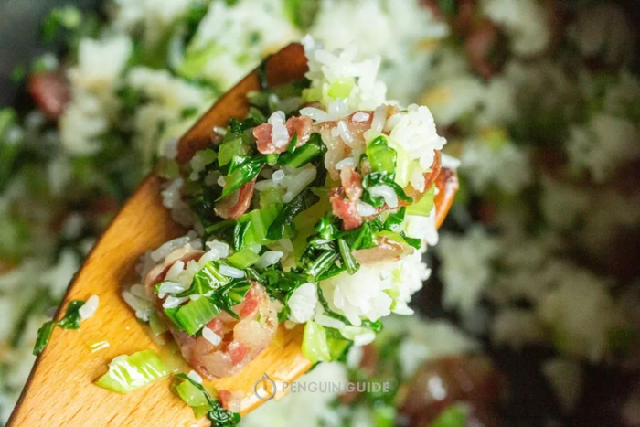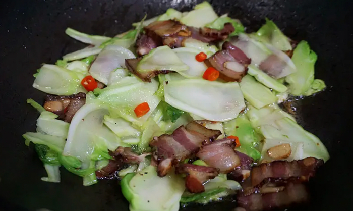 也可以爆炒。用蒜片干海椒爆香,再加上几片腊肉,原本苦涩的青菜,油润清香,菜茎部分又甜又糯,非常下饭。