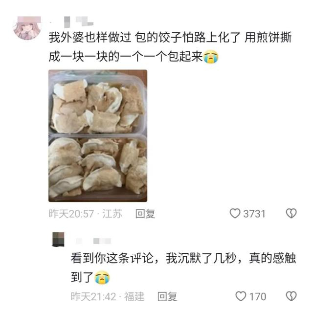 明女士记录了妈妈给自己的饺子,发布在社交平台,这条视频已经有近10万的点赞,引起了很多网友的共鸣,很多网友在评论区分享自己的经历,有人晒出外婆给自己寄的饺子说:“我外婆也样做过 包的饺子怕路上化了 用煎饼撕成一块一块的一个一个包起来。”,还有网友评论说:我妈妈每次给我寄的快递,大蒜都帮我剥好。”还有网友被触动:“全世界只有妈妈会为你做这种事。”