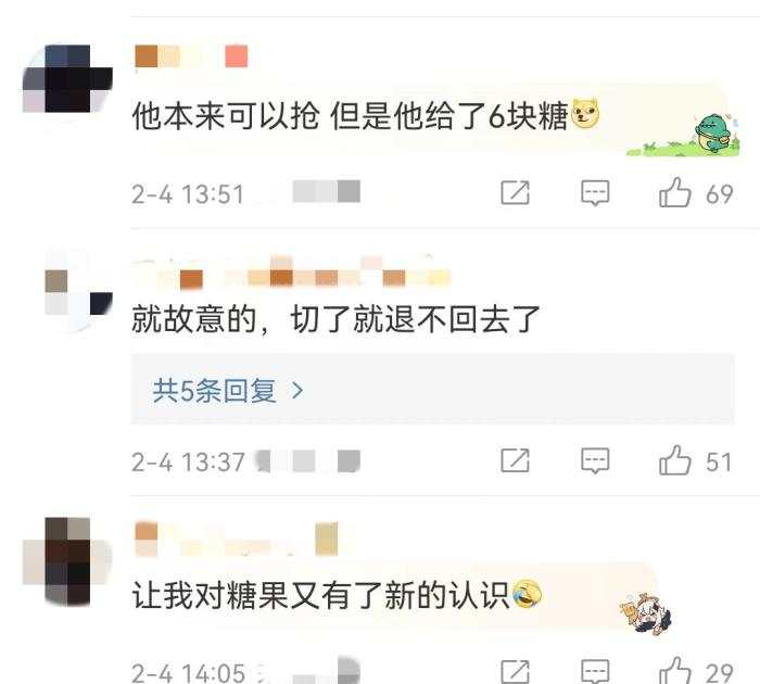 但这番说法并不能让网友接受:“卖切糕转行的?”“这妥妥的‘刺客’呀!”“他本来可以抢,但是他给了6块糖。”