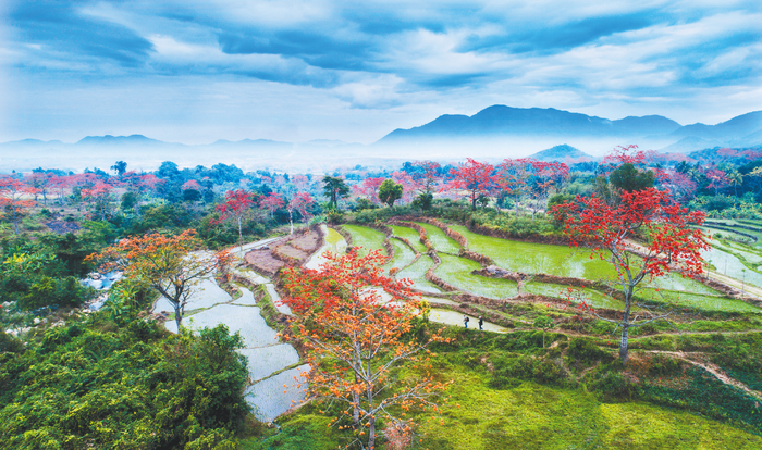 昌江木棉盛开红似火,与翠绿梯田相映成趣。