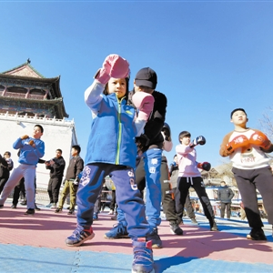 “好!漂亮!就这么打!出拳再稳一点!”记者来到鼓楼广场时,位于广场东门附近的拳击场地里站满了孩子,拳击教练们正在指导孩子们练习拳击技巧。“注意力集中!身体别放松!”其间,一些刚刚参加练习的孩子因体力消耗过大,精神难免不集中,刘玉贵和其他教练总是给予鼓励。听到教练和家长们的鼓励,孩子们咬着牙来了精神。孩子们认真的样子,也引来不少市民驻足观看。