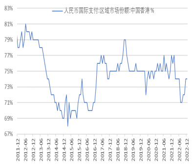 总体而言,2022年人民币国际支付占比保持在国际前列,占比份额保持稳定,跨境贸易结算业务中的份额和权重与之相当。其中,香港地区在人民币国际支付领域依然发挥着重要作用。