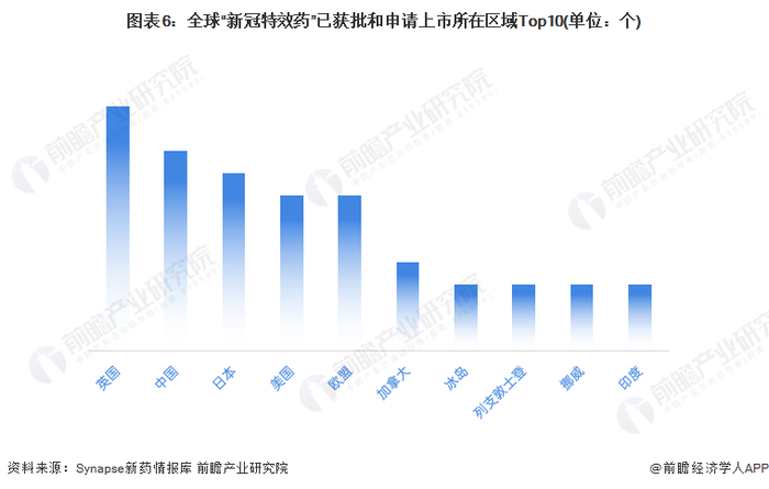对全球21个已获批和申请上市的“新冠特效药”获批区域进行统计发现,21个药物中有11个药物在英国获批或申请上市。跟在其后的是中国、日本、美国和欧盟,分别有9、8、7、7个药物在当地获批或申请上市。