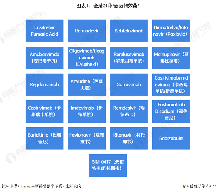 “新冠特效药”主要是以阻断病毒复制的形式在人体内发挥效用的药物(本文中统计的获批指“包含正常审批程序和特殊审批”)。根据前瞻的统计,截至2023年1月13日,全球已批准上市和已申请上市的“新冠特效药”共计21种。