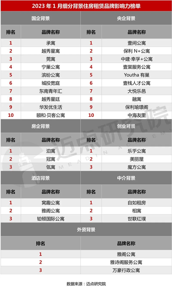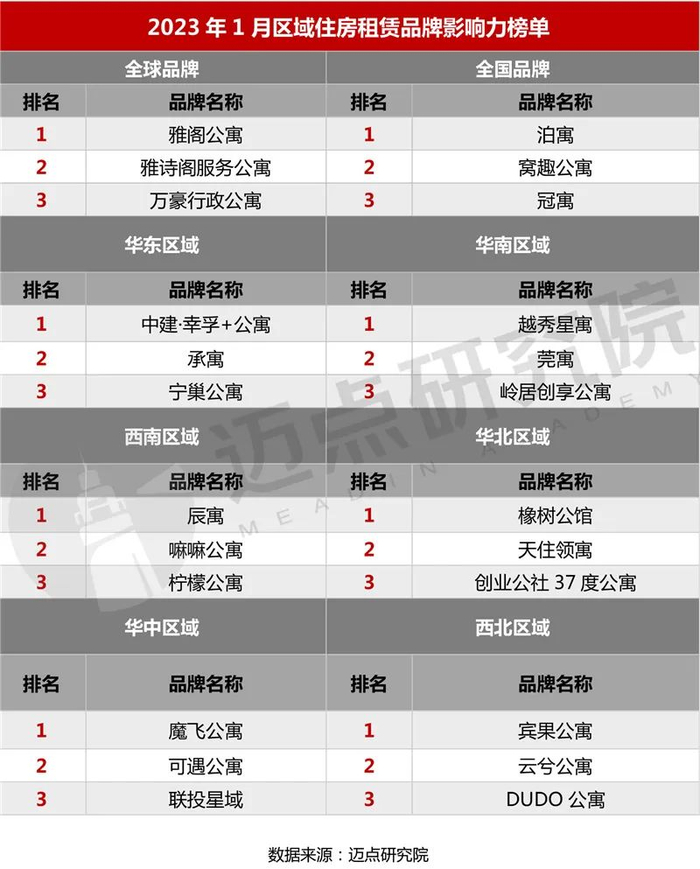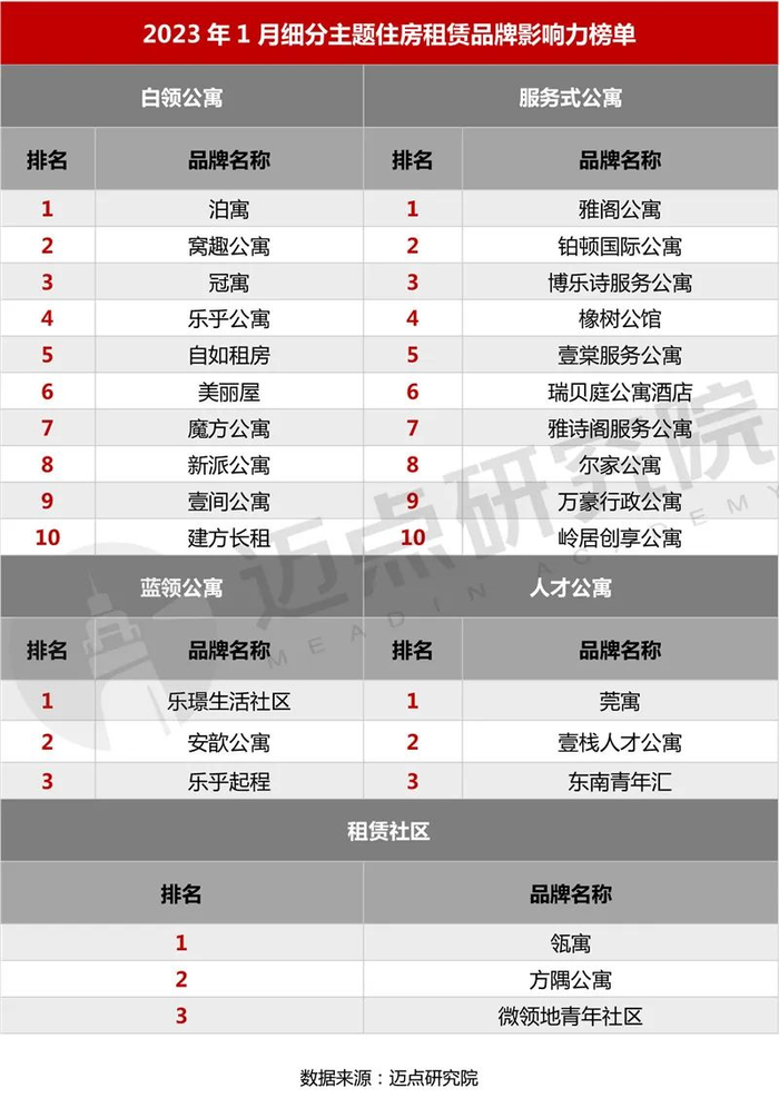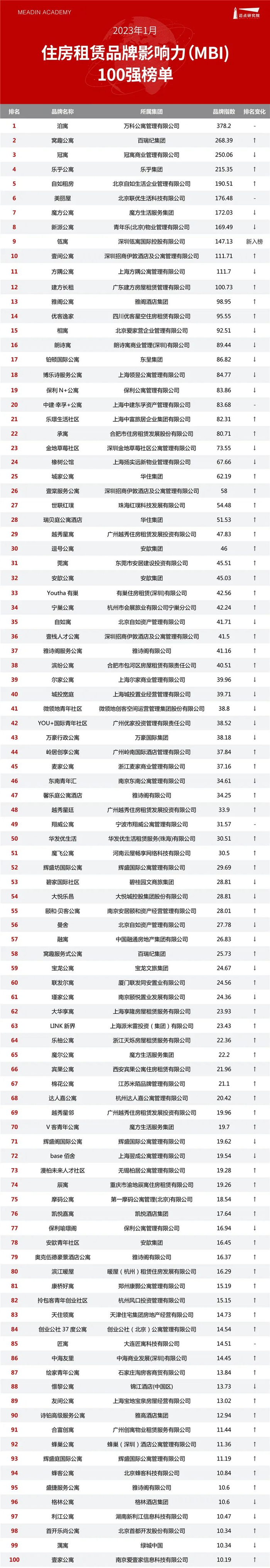 以下是迈点研究院独家发布的“2023年1月住房租赁品牌影响力(MBI)100强榜单”。本月泊寓、窝趣公寓、冠寓、乐乎公寓、自如租房、美丽屋、魔方公寓、新派公寓、瓴寓、壹间公寓进入榜单前十。