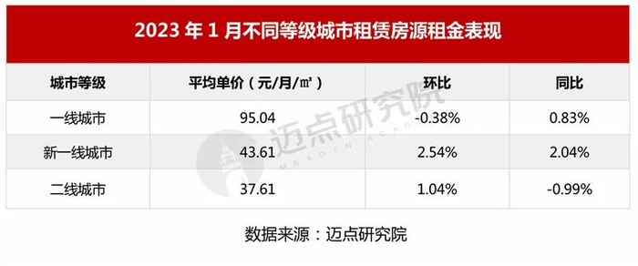 重点城市中,二线城市租赁房源均价为37.61元/平方米,环比上涨1.04%,同比下跌0.99%。1月,济南和石家庄的租金分别为37.19元/月/㎡和28.03元/月/㎡,环比分别上升8.24%和8.48%。