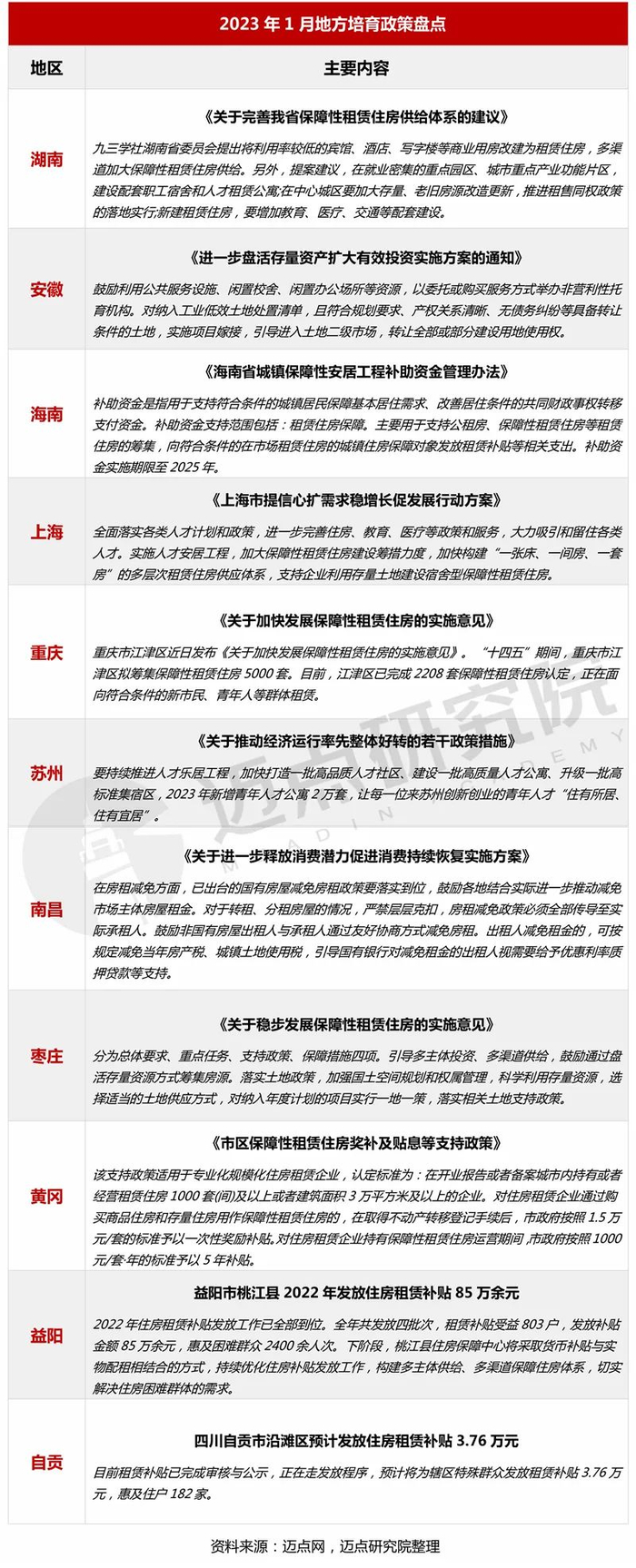 1月,地方政府加大保障性租赁住房建设筹措力度,持续优化住房补贴发放工作,构建多主体供给、多渠道保障住房体系。在市场培育方面,湖南、安徽强调多渠道加大保障性租赁住房的供给;上海、苏州从吸引人才和留住人才的角度加快构建人才安居工程;益阳市桃江县、四川自贡市沿滩区做好住房租赁补贴审核发放工作,以构建多主体供给、多渠道保障住房体系,持续优化住房补贴发放工作,构建多主体供给、多渠道保障住房体系,切实解决住房困难群体的需求。