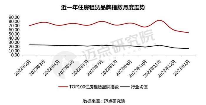 1月,住房租赁品牌100强的平均品牌指数为53.31,环比下降10.66%;行业均值15.37,环比下降10.94%。相比12月,长租公寓品牌指数整体呈现下降态势。