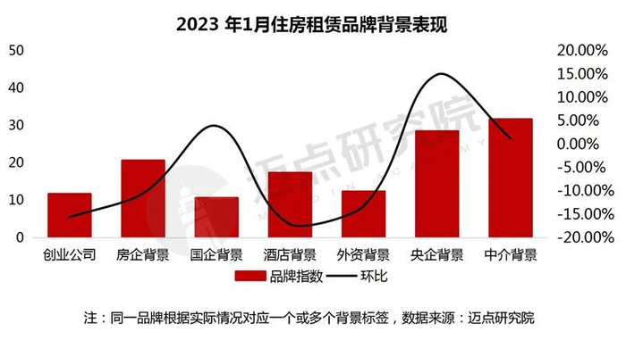 在住房租赁品牌的细分背景中,从环比来看,本月央企背景品牌表现最为突出,热度提升最快。相比上月,招商伊敦旗下的壹间公寓、壹棠服务公寓和壹栈人才公寓等品牌排名增长,位列央企背景住房租赁品牌榜单第一名。